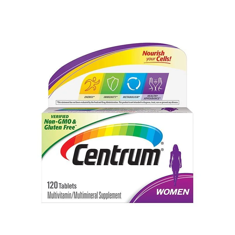 • 120 count supply of Centrum Multivitamin for Women, Multivitamin/Multimineral Supplement with Iron, Vitamins D3, B and Antioxidants