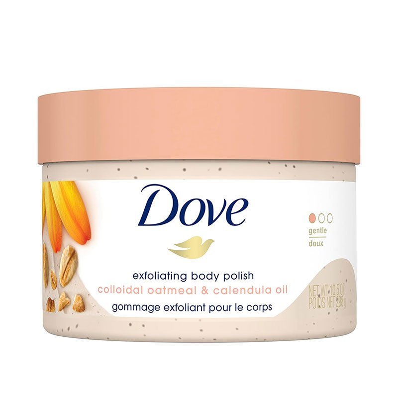 - GENTLE EXFOLIATION – Made with small-sized exfoliating particles, Dove Exfoliating Body Polish Colloidal Oatmeal and Calendula Oil are smooth and easily spreadable with a mild lather.