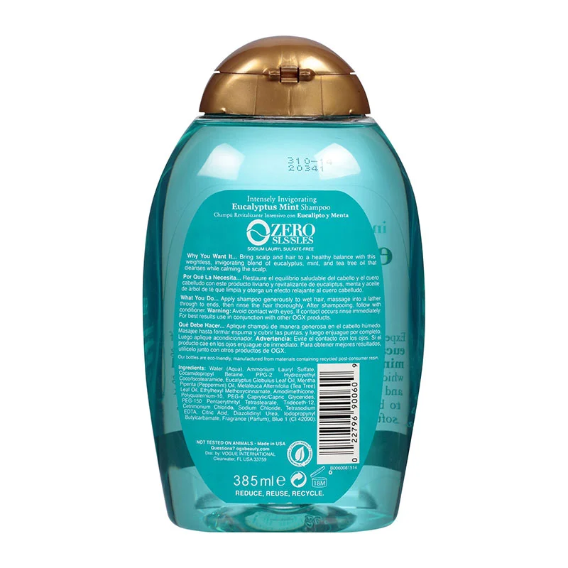 - OGX Eucalyptus Mint Shampoo gently cleanses and balances while calming itchy scalp