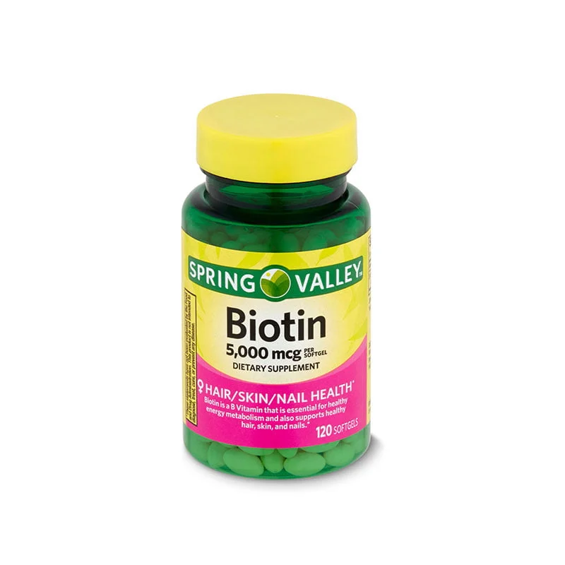 Spring Valley Biotin Dietary Supplement, 5,000 mcg, is a B vitamin supplement that is essential for healthy energy metabolism and also supports healthy hair, skin, and nails. The suggested dose for adults is one softgel once or twice a day, preferably with a meal.