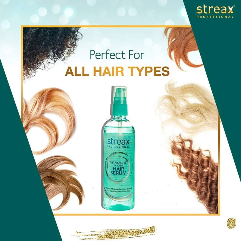 Streax Professional Vitariche gloss Hair Serum will give you that gorgeous, salon-fresh look. Its unique mix of ingredients including Macadamia Oil and Vitamin E helps nourish, smoothen and transform your hair strands making it frizz-free while shine enhancers give you shiny and sleek hair.